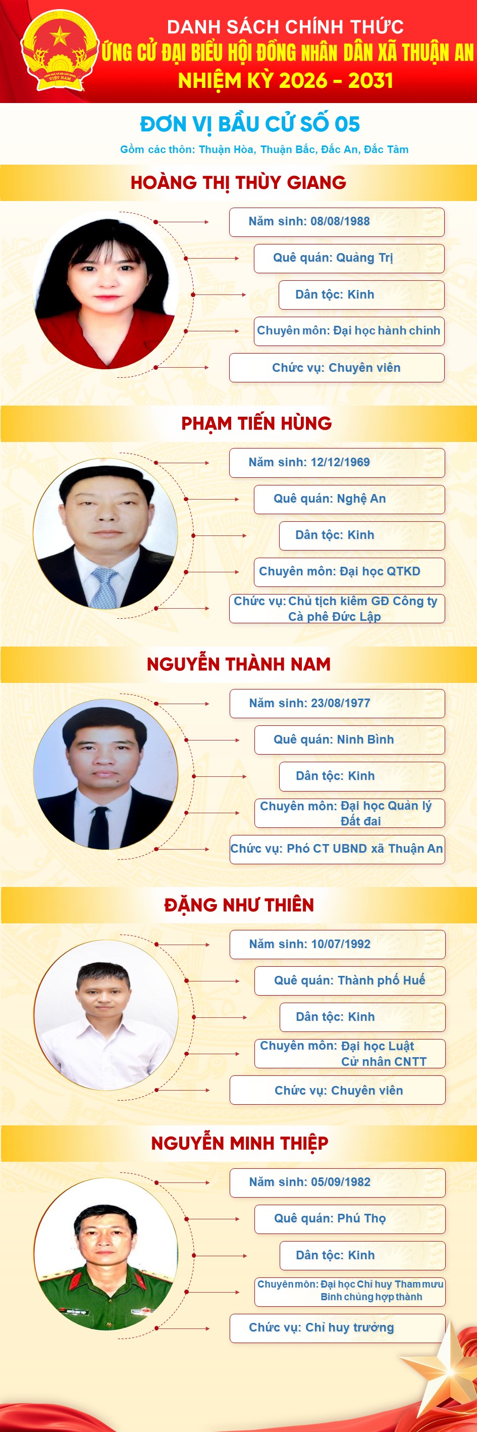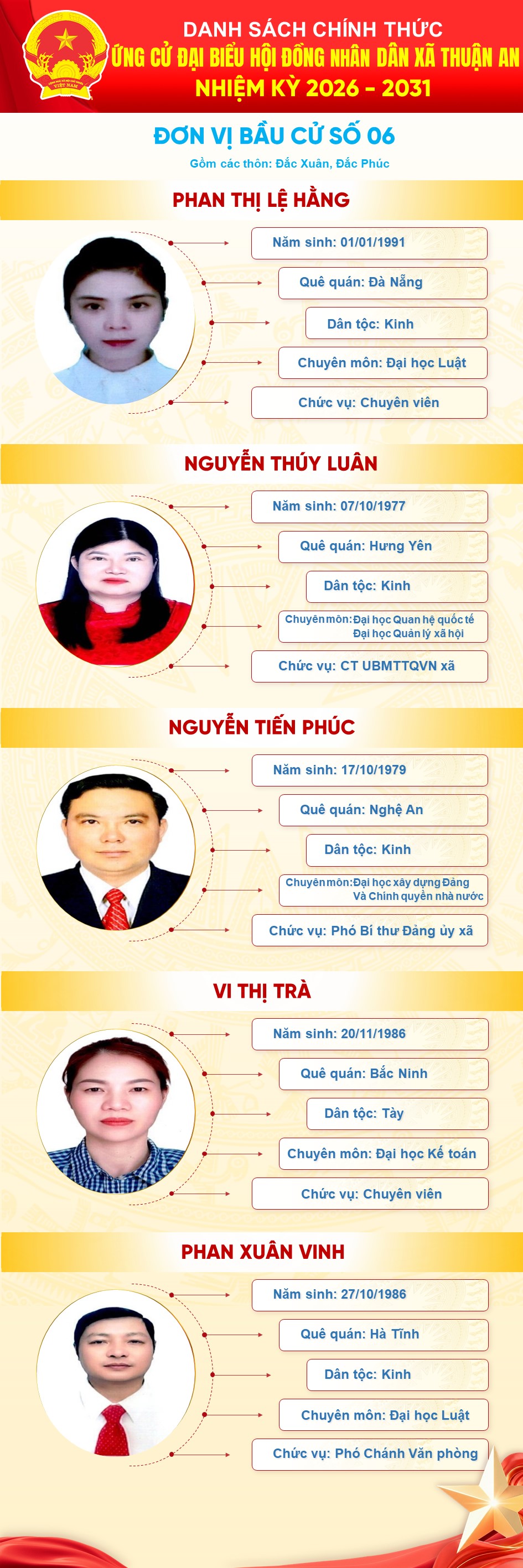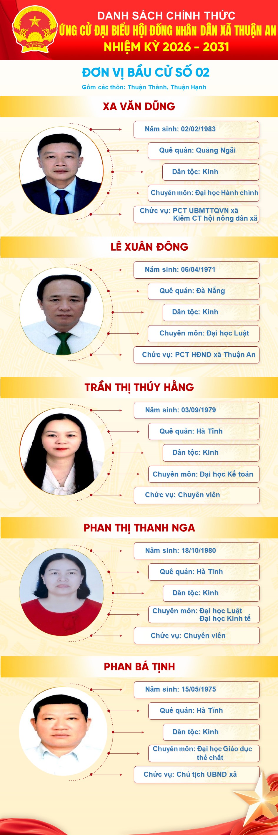 DANH SÁCH NHỮNG NGƯỜI ỨNG CỬ ĐẠI BIỂU HĐND XÃ THUẬN AN NHIỆM KỲ 2026-2031 TẠI 08 ĐƠN VỊ BẦU CỬ TRÊN ĐỊA BÀN XÃ THUẬN AN