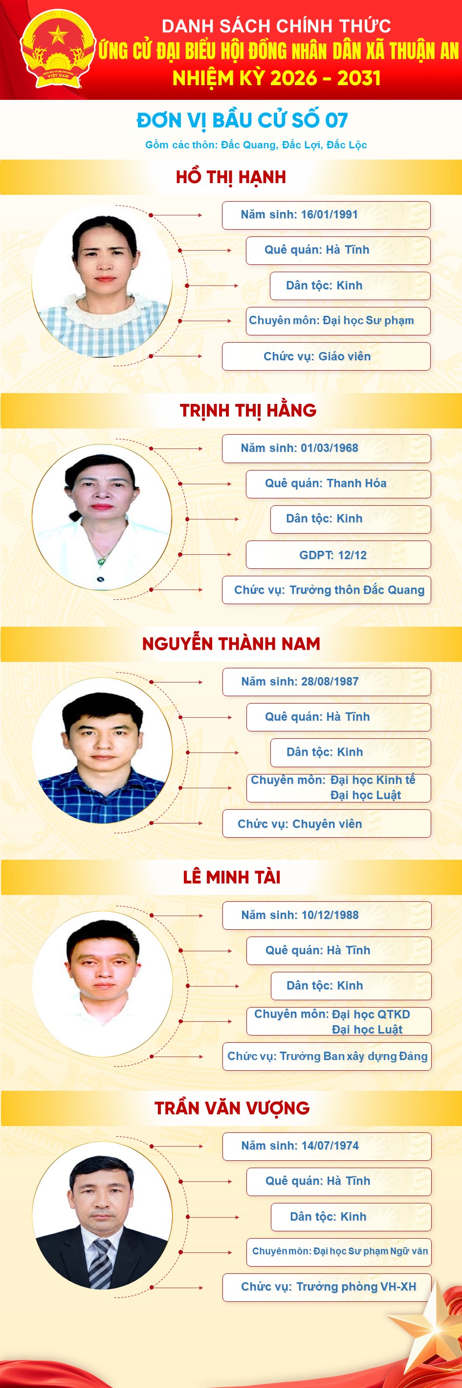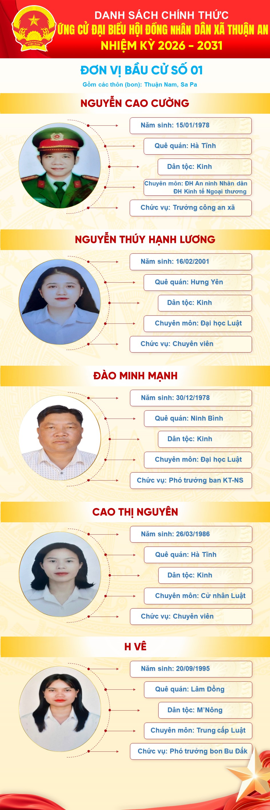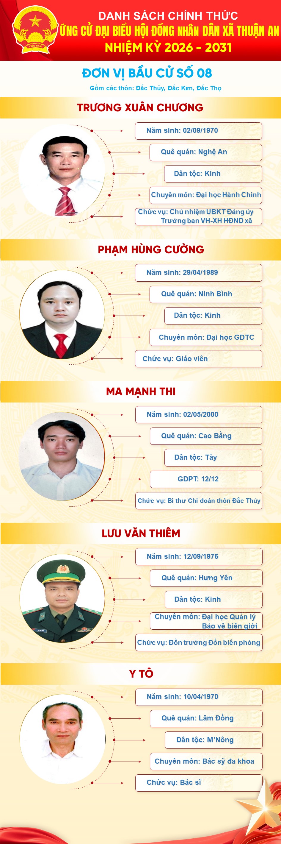 DANH SÁCH NHỮNG NGƯỜI ỨNG CỬ ĐẠI BIỂU HĐND XÃ THUẬN AN NHIỆM KỲ 2026-2031 TẠI 08 ĐƠN VỊ BẦU CỬ TRÊN ĐỊA BÀN XÃ THUẬN AN