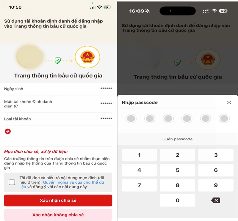 Bước 4: Tích vào ô: “Tôi đã đọc và hiểu rõ nội dung mục đích”, ấn Xác nhận chia sẻ, sau đó nhập mã Code (mã bảo vệ gồm 06 chữ số) của ứng dụng VneID.