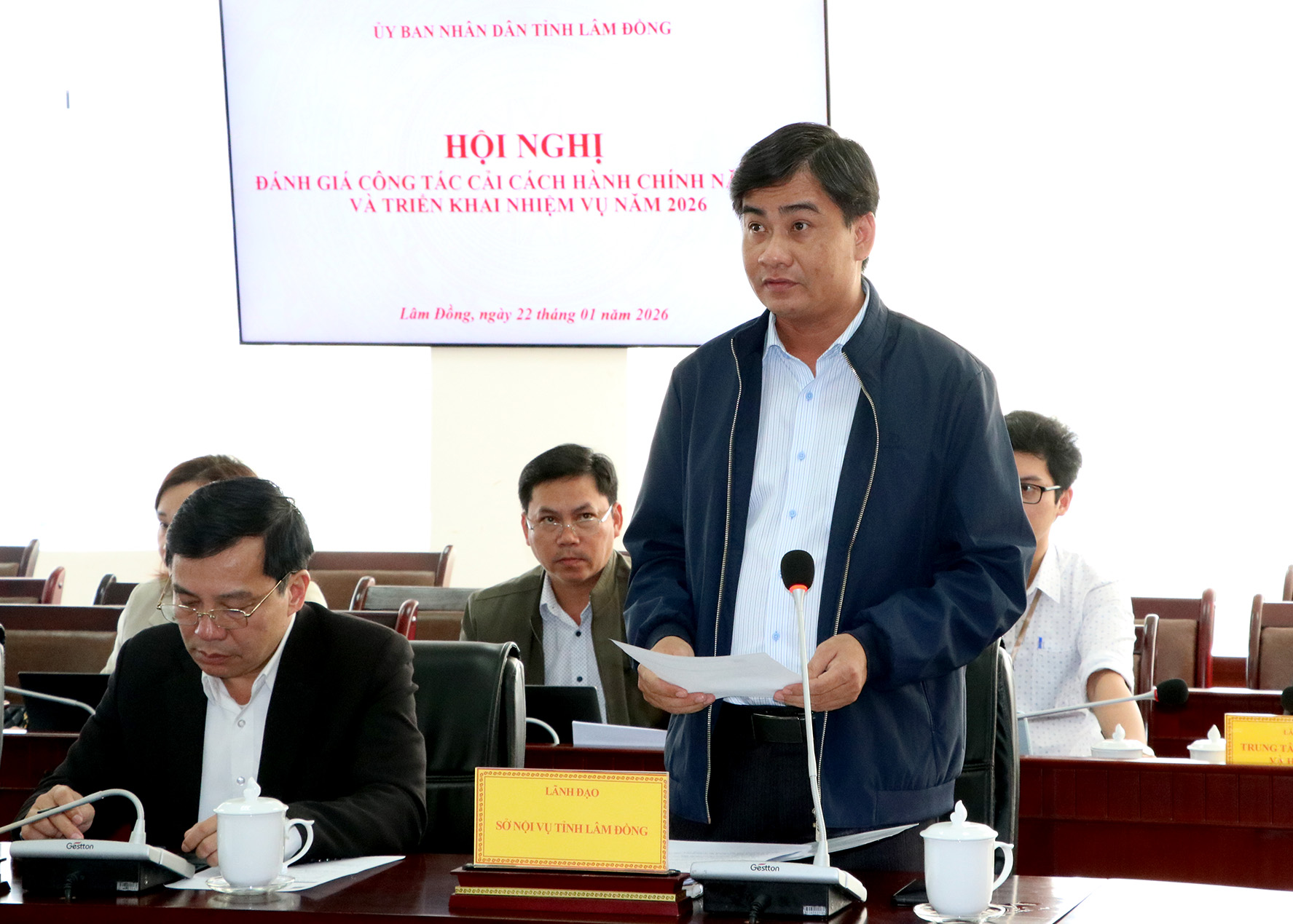 Ông Trần Hữu Tuấn - Phó Giám đốc Sở Nội vụ báo cáo tại cuộc họp
