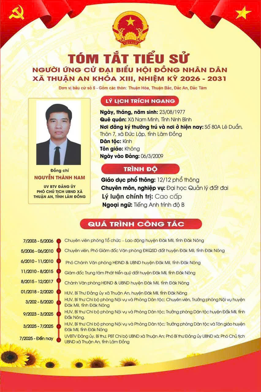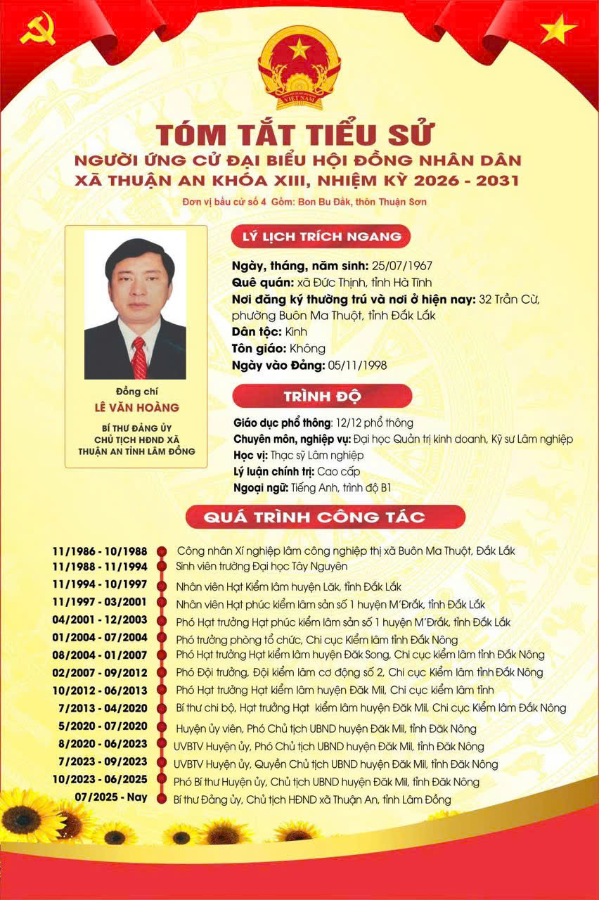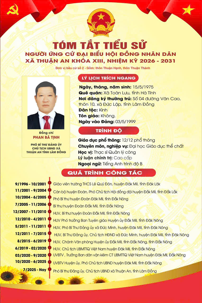 plus-circle Created with Sketch Beta. Aa Tin tứcBầu cử Đại biểu Quốc hội và HĐND các cấp, nhiệm kỳ 2026-2031 Lãnh đạo xã Thuận An ứng cử Đại biểu HĐND tỉnh, Đại biểu HĐND xã, nhiệm kỳ 2026-2031 02/03/2026 16:21 |   91 Your browser does not support the audio element. Lãnh đạo xã Thuận An ứng cử Đại biểu HĐND tỉnh, Đại biểu HĐND xã, nhiệm kỳ 2026-2031