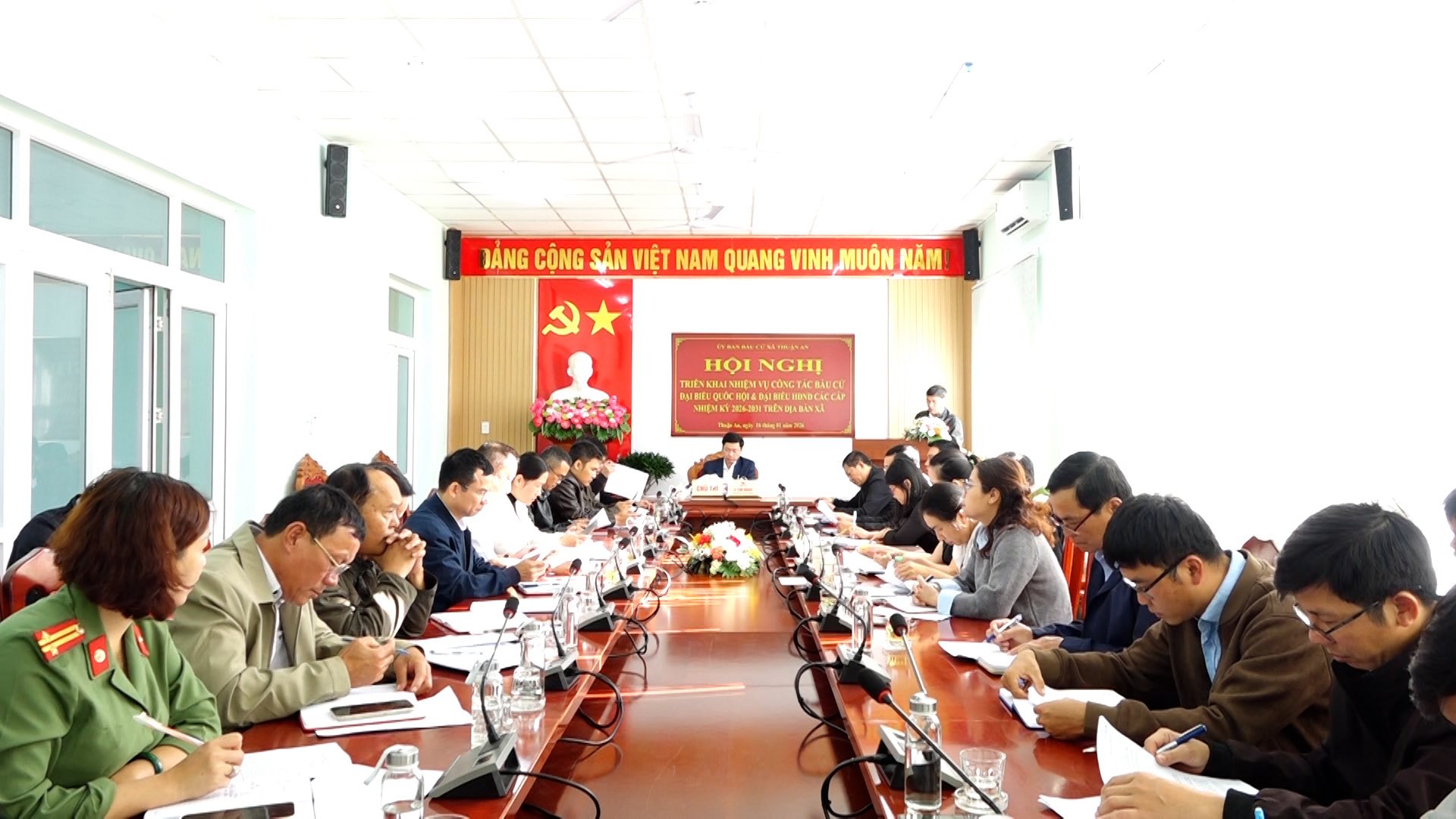 Kết luận hội nghị, đồng chí Lê Văn Hoàng ghi nhận tinh thần chủ động, trách nhiệm của các cơ quan, đơn vị trong triển khai nhiệm vụ thời gian qua; đồng thời yêu cầu Ủy ban Bầu cử xã, các bộ phận giúp việc và các cơ quan, ban ngành liên quan tiếp tục rà soát toàn bộ phần việc được phân công, cụ thể hóa tiến độ, rõ người, rõ việc, rõ trách nhiệm. Đồng chí nhấn mạnh yêu cầu thực hiện nghiêm túc quy trình hiệp thương, giới thiệu người ứng cử; đẩy mạnh công tác tuyên truyền, tạo không khí phấn khởi, đoàn kết, trách nhiệm trong cán bộ, đảng viên và Nhân dân, góp phần tổ chức thành công cuộc bầu cử đại biểu Quốc hội khóa XVI và đại biểu HĐND các cấp nhiệm kỳ 2026–2031 trên địa bàn xã Thuận An./